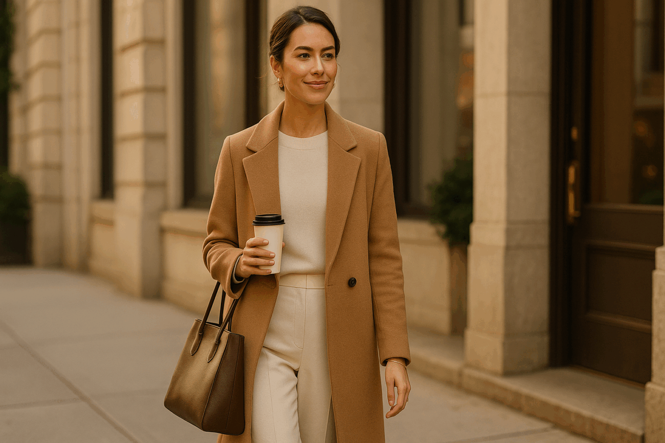 Réduisez les couleurs de votre garde-robe à noir, blanc, marine, camel et gris. Évitez les motifs, imprimés ou couleurs vives. Cela crée un look cohérent et volontaire, rendant votre tenue élégante sans effort. Porter tout en noir avec un accessoire camel semble réfléchi plutôt qu’accidentel.
