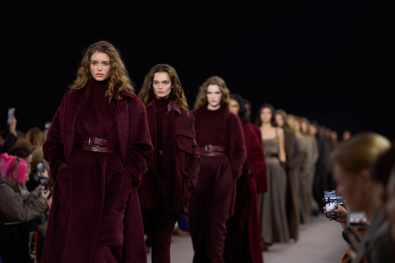 Fuyant les doudounes, les manteaux chics de l’Automne-Hiver 25 présentent des silhouettes cocon douces avec des lignes fluides et des détails d’écharpes. Les couleurs classiques comme le gris et le vert olive sont dominantes, et pour la saison des fêtes, on trouve des capes longues et majestueuses. L’accent est mis sur un façonnage raffiné et le mouvement.